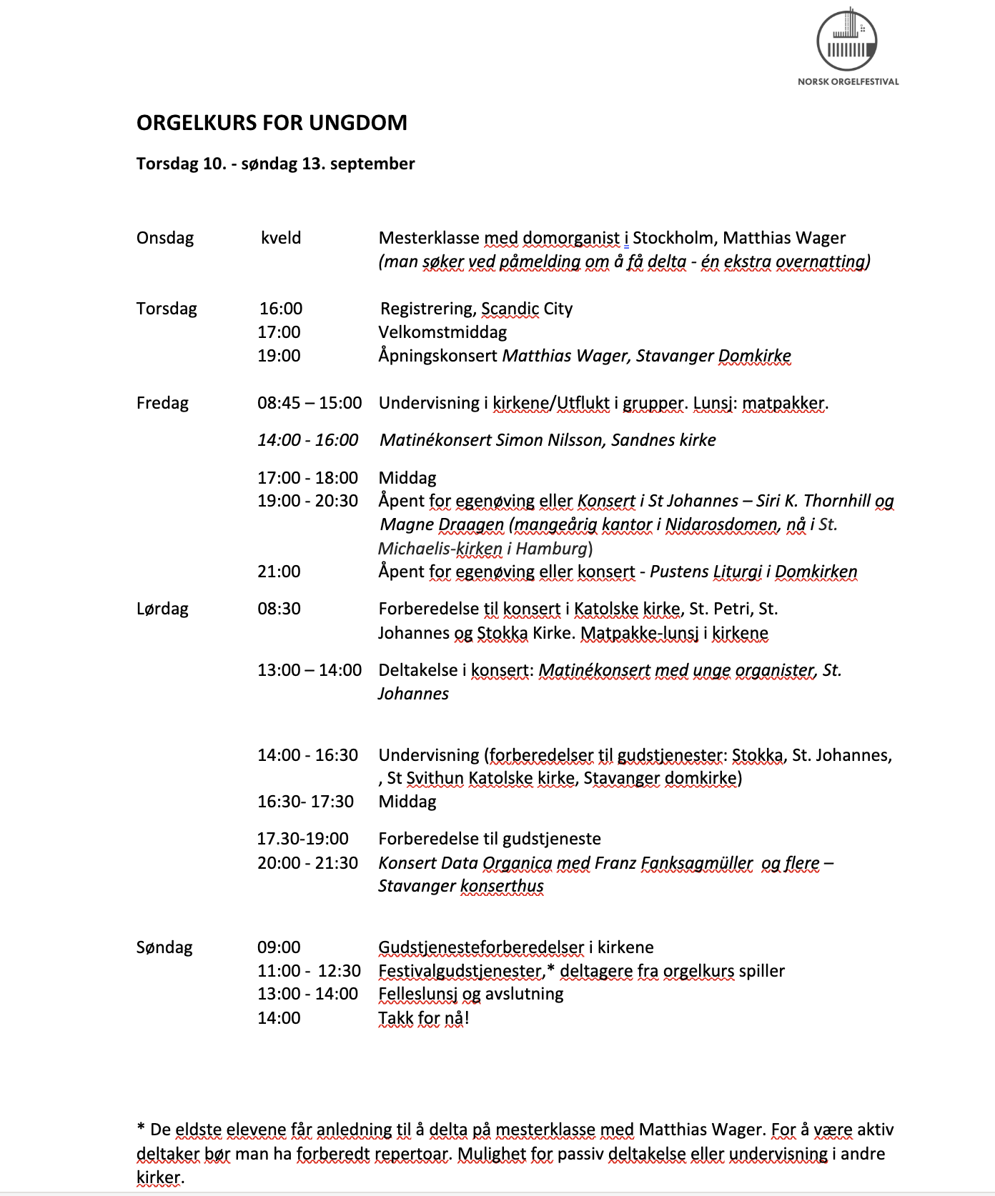 I år får noen av elevene anledning til å delta på mesterklasse med domorganist i Stockholm, Mattias Wager. Mesterklassen er onsdag kveld. Man må ha forberedt repertoar og søkt spesielt om å få delta. Du søker i samme skjema som for ungdomskurset. De som får plass får beskjed om det før sommeren. Norsk orgelfestival dekker en ekstra overnatting på festivalhotellet.